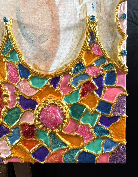 The Royale Crown paintings are characterized by the use of gilded cresting parabolas to frame, enhance and elevate the subject. My Bejeweled Mosaic technique fills the surrounds with multi-colored, organically shaped semi-precious looking stones and gem-like elements. Most notably, I use intricate piping and paint sculpting techniques to fill the surround with bright, colorful and shimmering jewel-like facets.