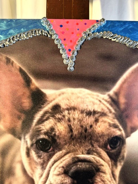 My signature Royale Expressionist Paintings are highly technical and sculpted artworks which borrow from extreme baroque, bejeweled and royal aesthetics.  I sculpt with paints to frame and transform your picture on canvas into an opulent spectacle, worthy of the subject.  The Royale style incorporates new techniques like piping acrylic paint (think cake decorating), the use of glitter/metallics, and extreme impasto to create a three dimensional painting with exaggerated visual appeal, emotion, a sense of whimsy and even a little humor.  My Royale Majaraja paintings are inspired by the far east and characterized by sculpting and curving paint in dramatic, regal and mellifluous ways to frame, enhance and elevate the subject.